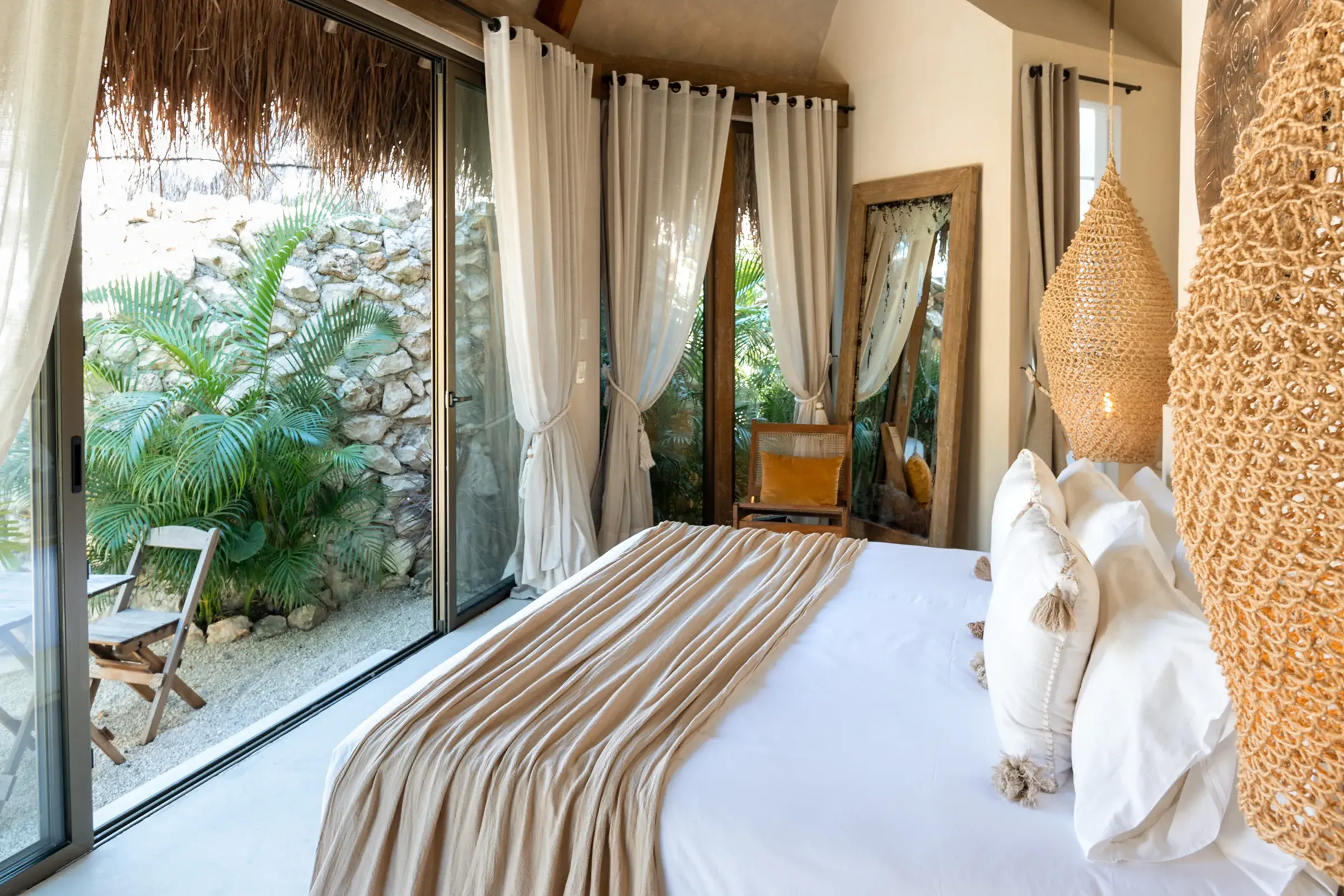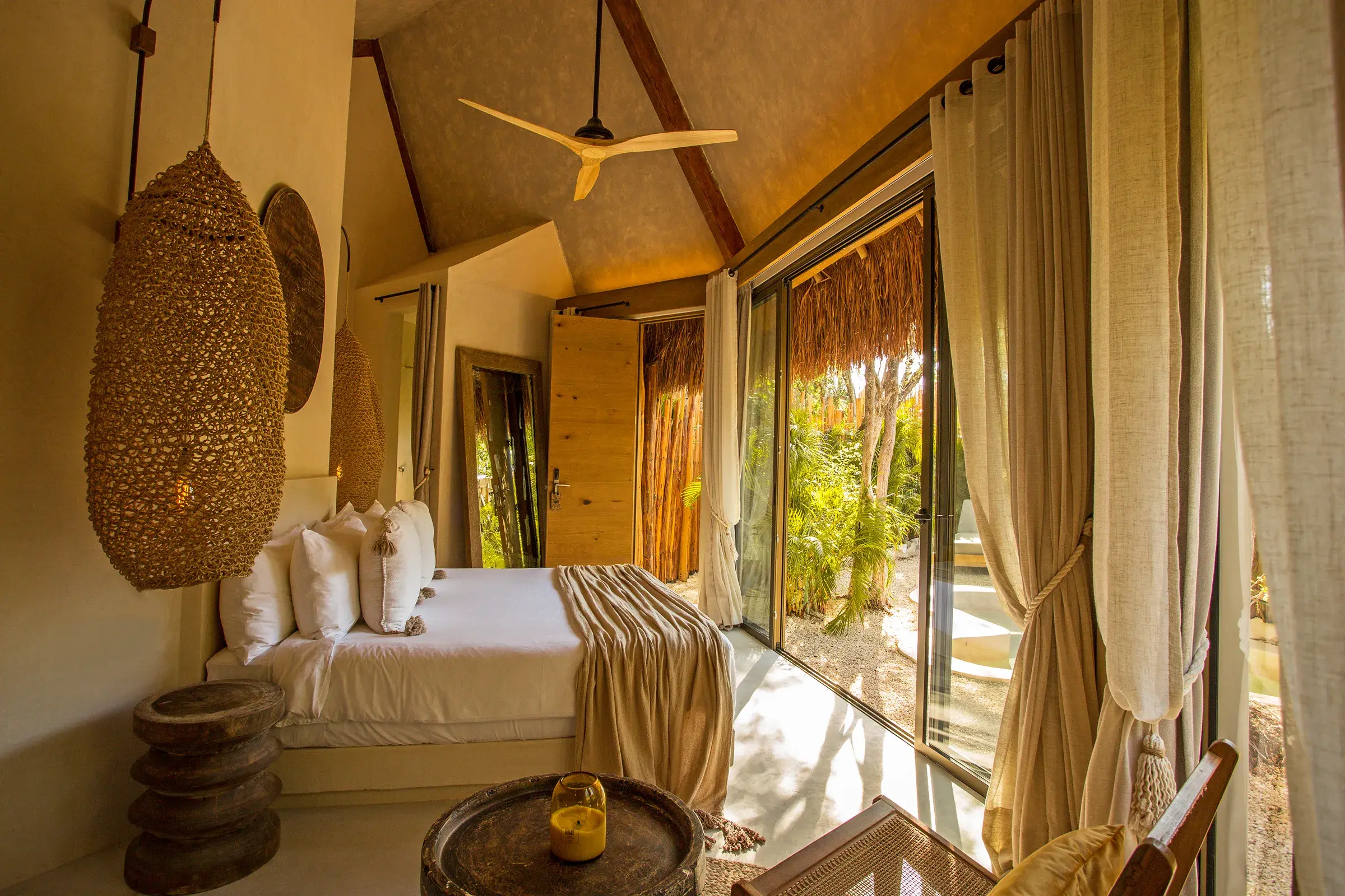 Aquí, el tiempo no se mide con relojes, sino con los cambiantes tonos del cielo, el suave murmullo de los manglares y los susurros de la brisa selvática. Cada espacio está adornado con decoración artesanal, materiales de origen local y el arte de los mejores maestros de Tulum, creando una atmósfera que es a la vez terrenal y etérea.