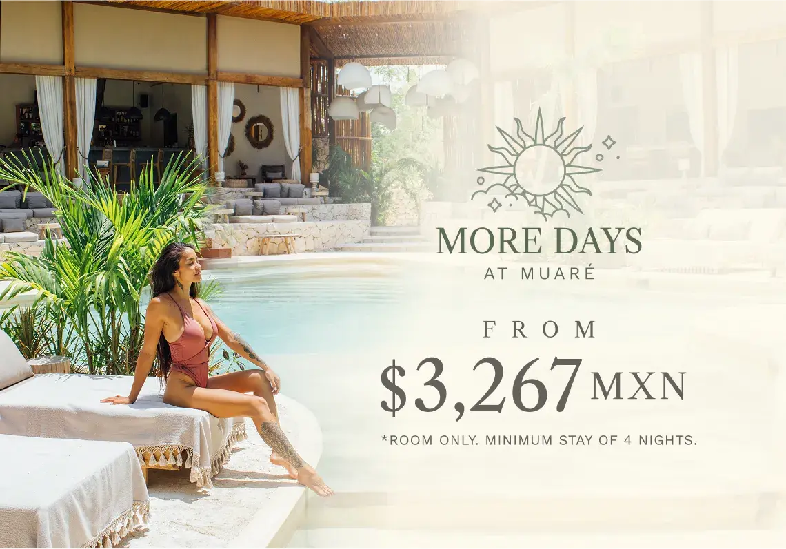 Let the rhythm of the jungle and the calm of the Caribbean be your companions. With our More Days at Muaré promotion, every sunrise becomes a moment of connection, rest, and unhurried pleasure. Relax in your private villa, wake up to the sounds of nature, and enjoy the freedom to savor each moment at your own pace.